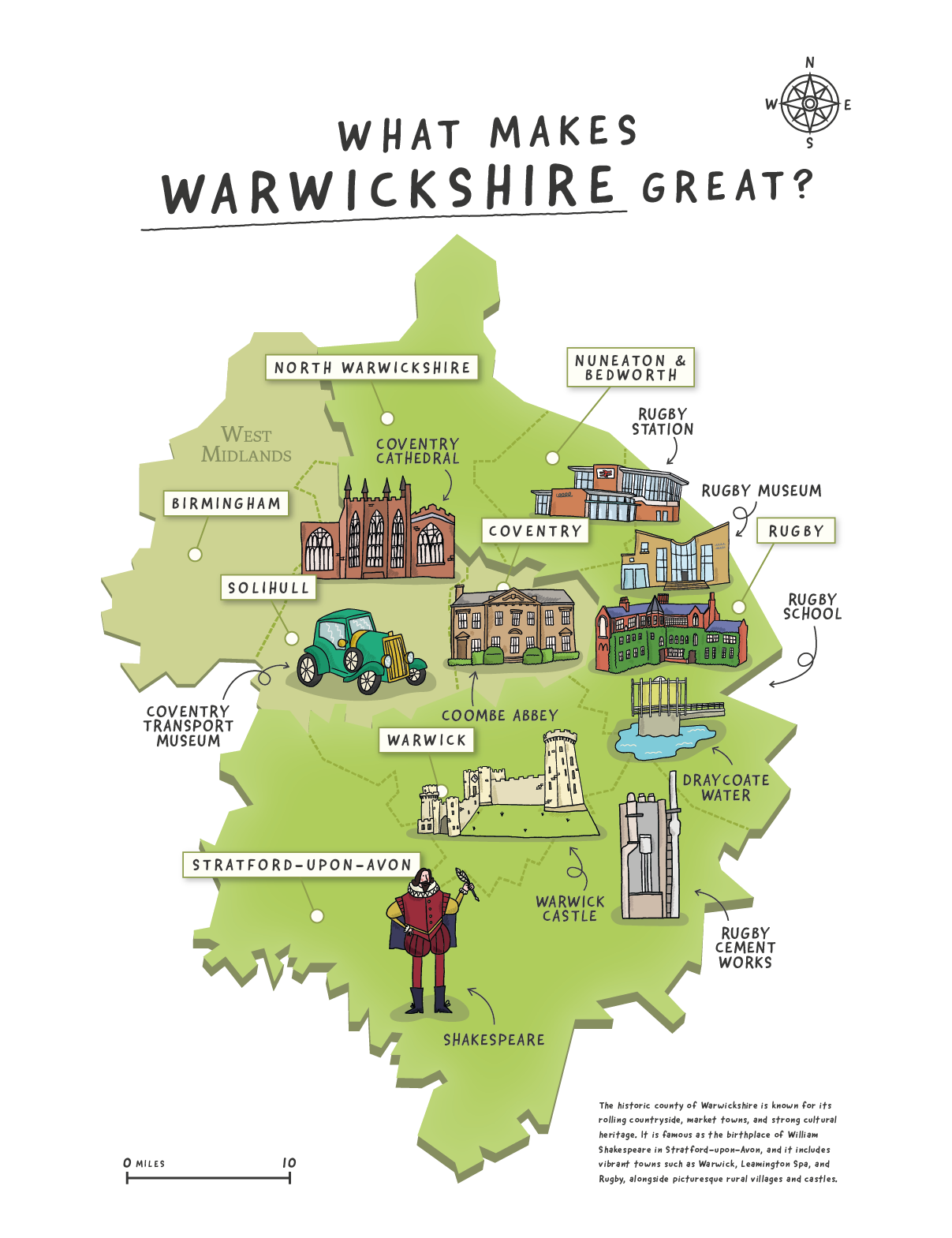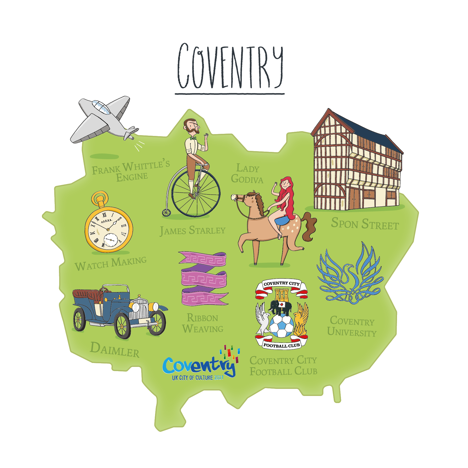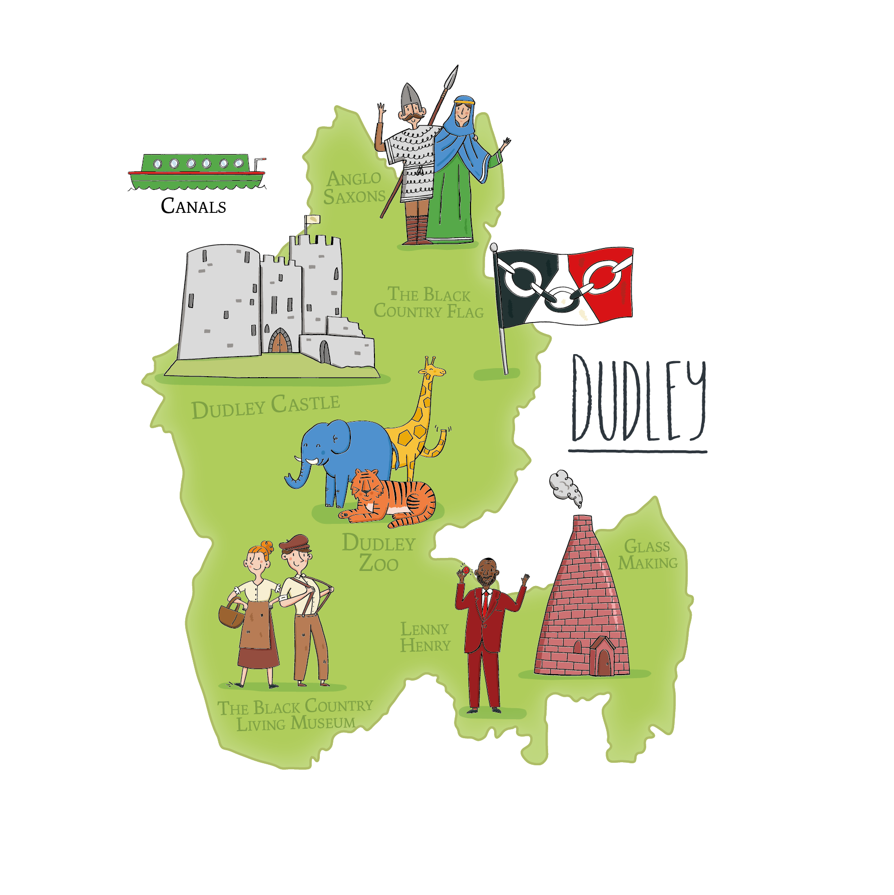 Illustrations of buildings and structures reflect Britain’s layered history, from historic landmarks to more familiar everyday architecture.