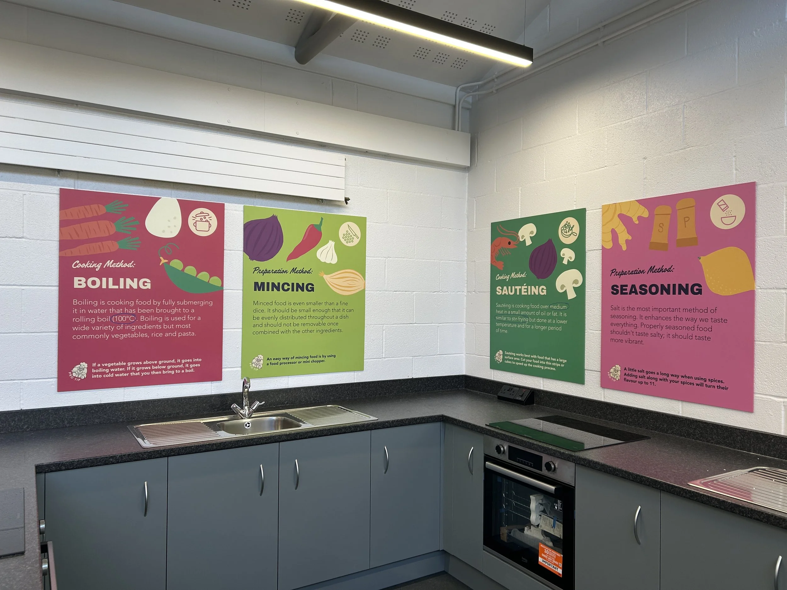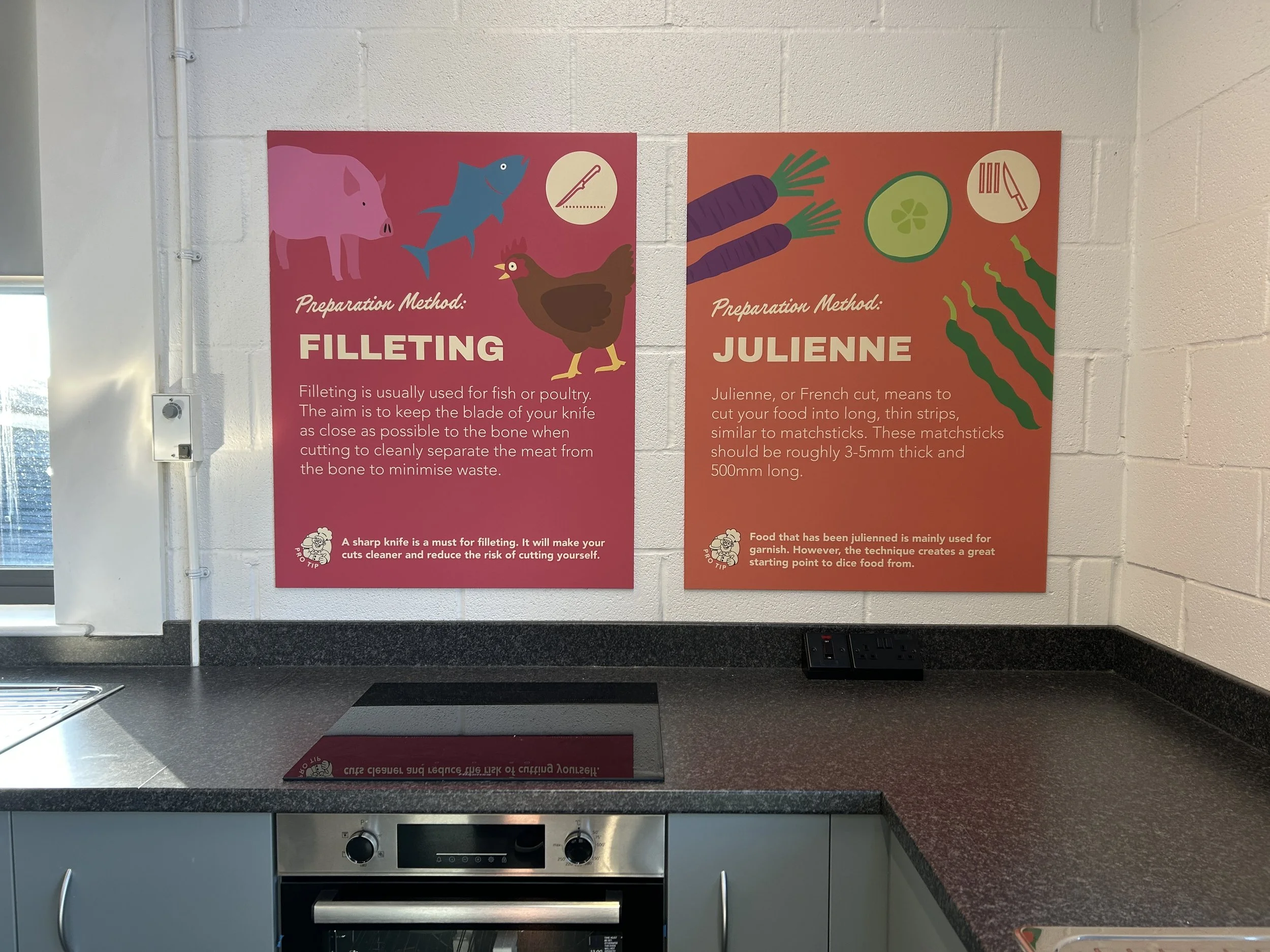Food for Thought is an illustration-led project designed for schools to make food feel fun, friendly, and accessible, encouraging confidence and curiosity around cooking. Focusing on ingredients in their simplest form, the work breaks meals down into familiar building blocks, pairing illustrated food words and imagery with themes of preparation. The visuals are intentionally naive and playful, celebrating the natural shapes of different foods through hand-drawn, colourful, and imperfect illustrations that bring warmth and personality to the learning environment.