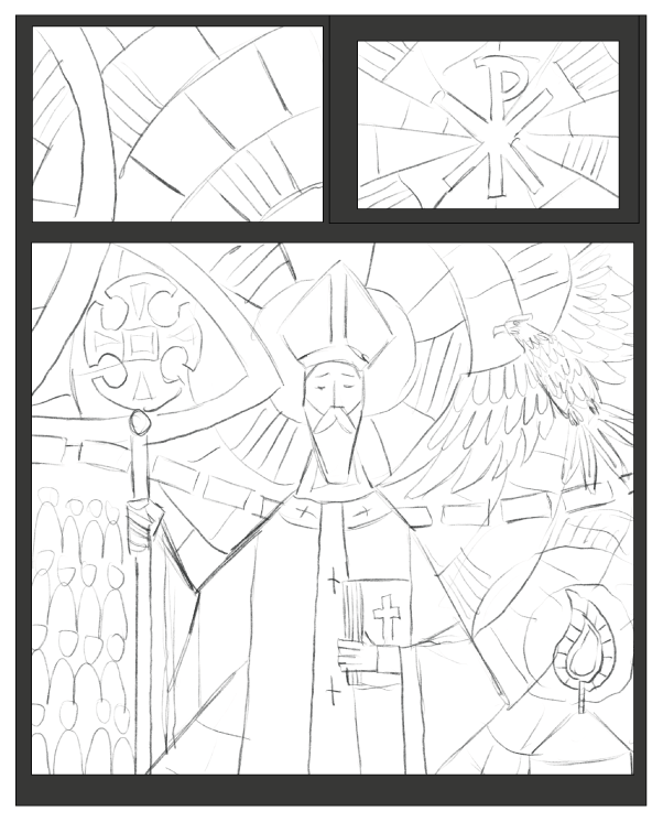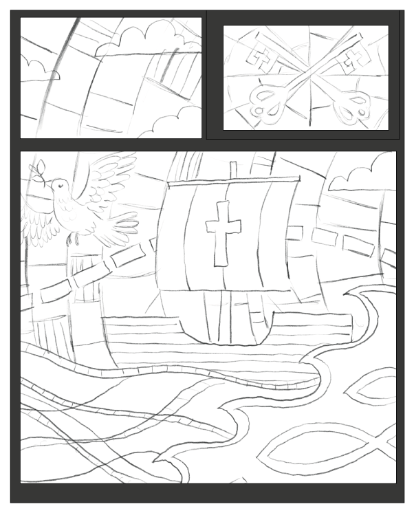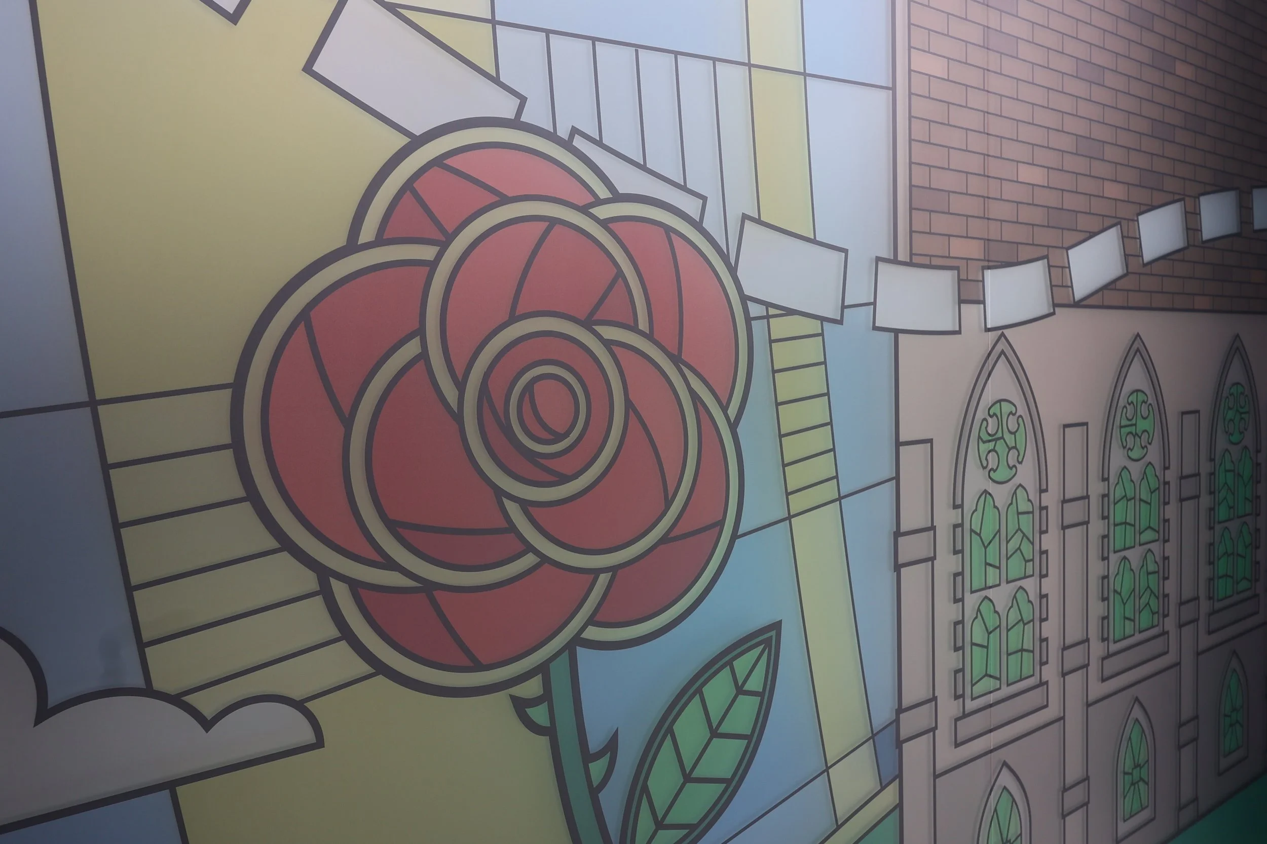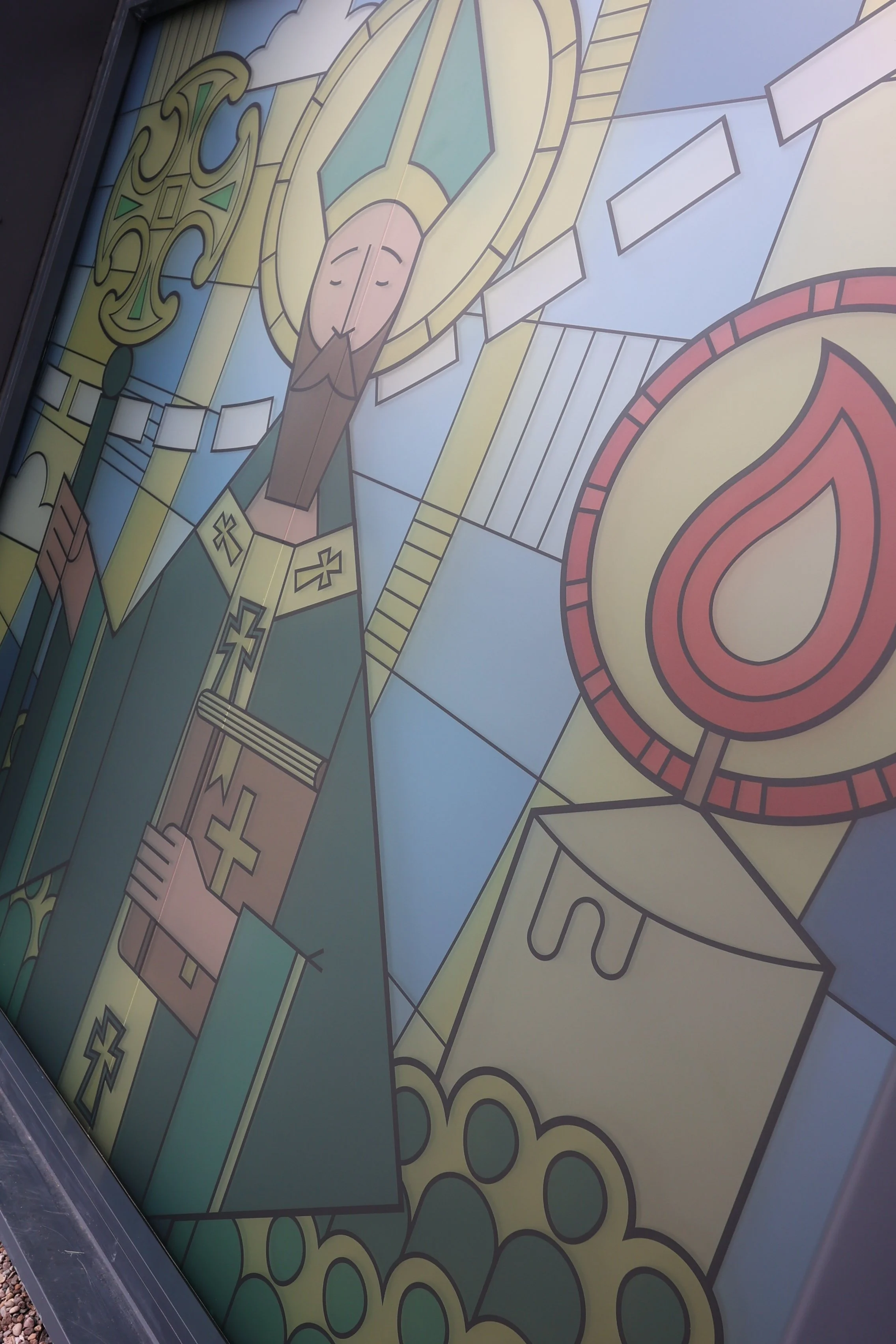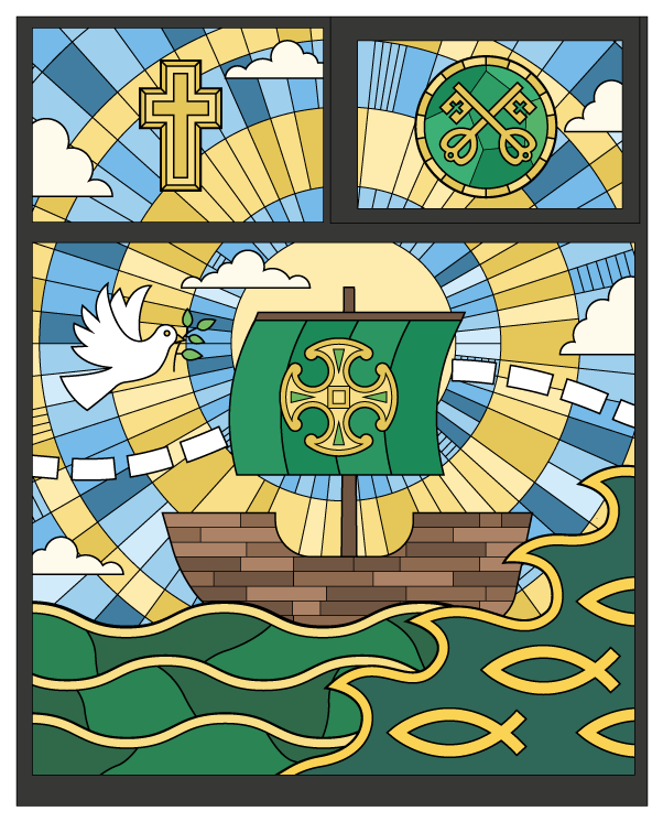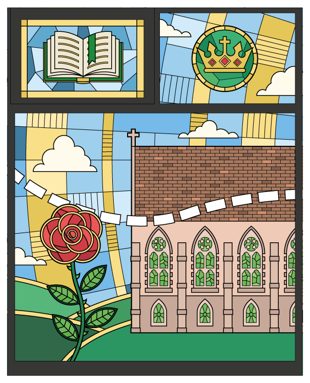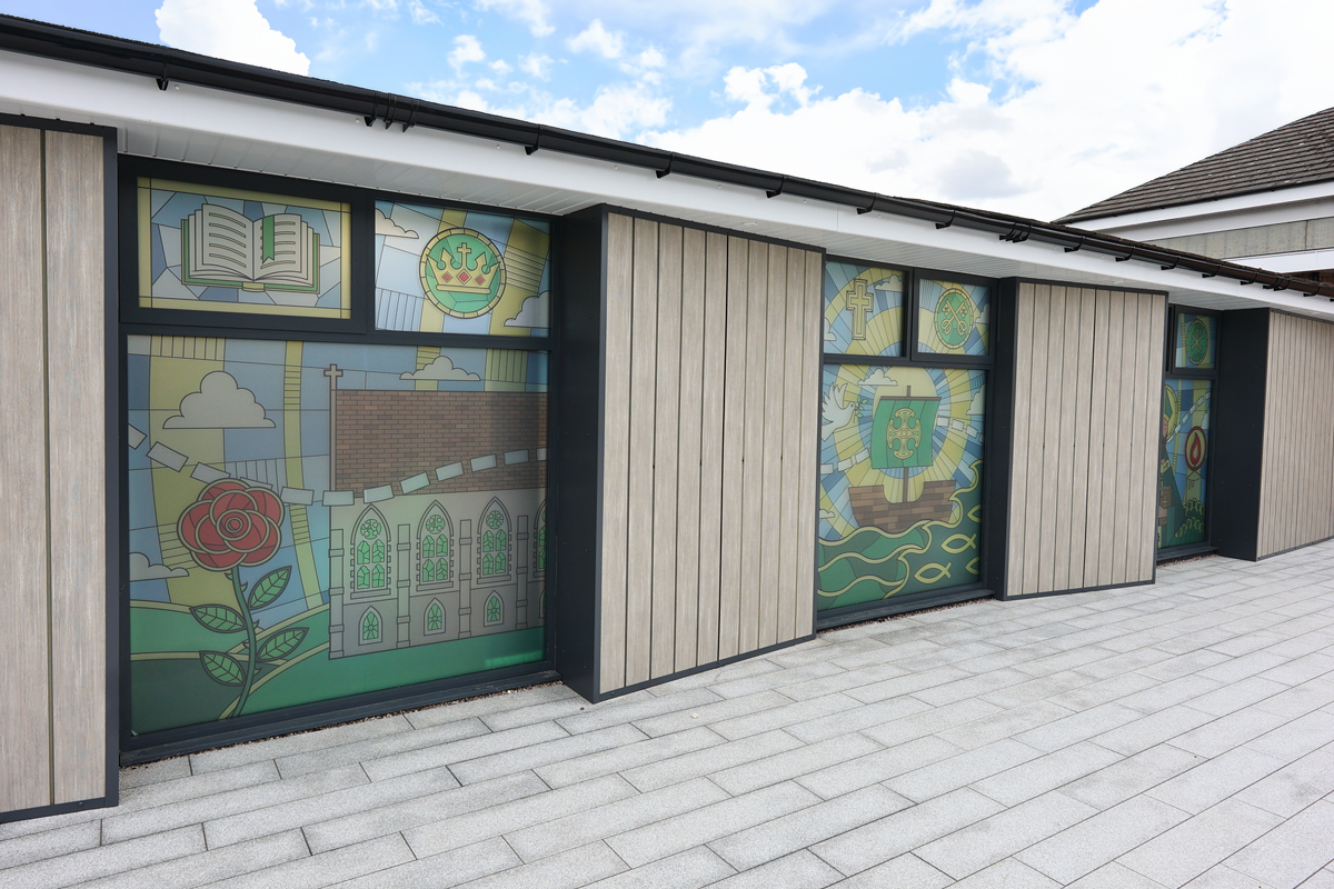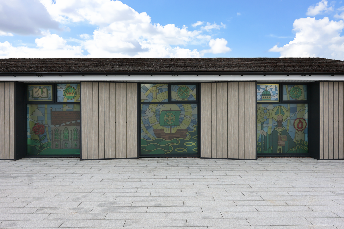 Spanning three windows, this stained glass-inspired piece traces the journey of the school’s namesake, Saint Augustine, from Rome to England, weaving together moments of travel, faith, and transformation. The design subtly mirrors the school’s own ethos, reflecting the learning journey their students embark on each day, and connecting historical narrative with the growth and curiosity fostered within the classroom.