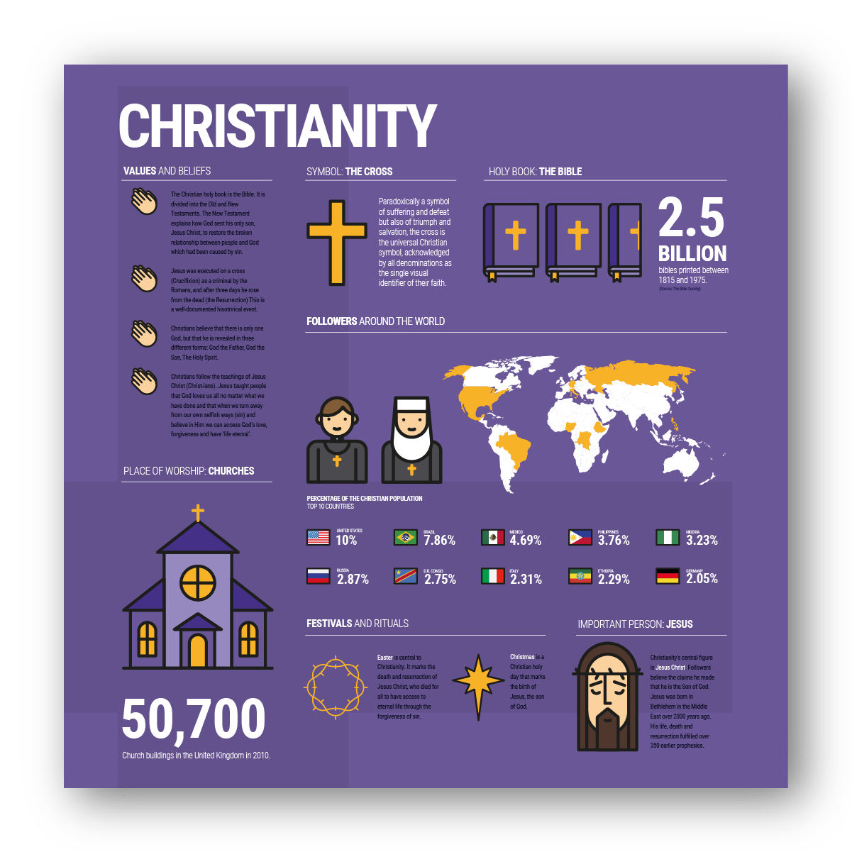 Faith is an icon-based design created to introduce students to the six main world religions. The bespoke icons alongside key facts offers an accessible starting point for understanding belief systems from around the world.